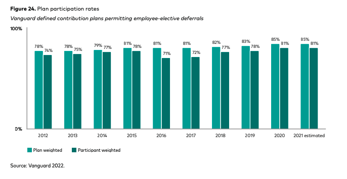 That’s the participation rate for 2022, according to the latest survey by Vanguard. That’s great! But what’s to account for these high participation rates?